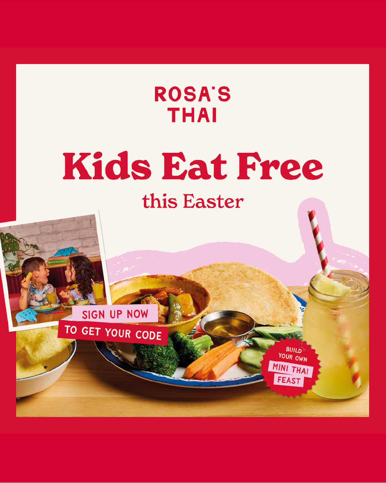 March 30 to April 17 - Rosa's Thai are running a kids eat free offer with the purchase of a main. Guests can sign up here to receive a code for a free meal from their kid friendly Little Rosa’s menu.